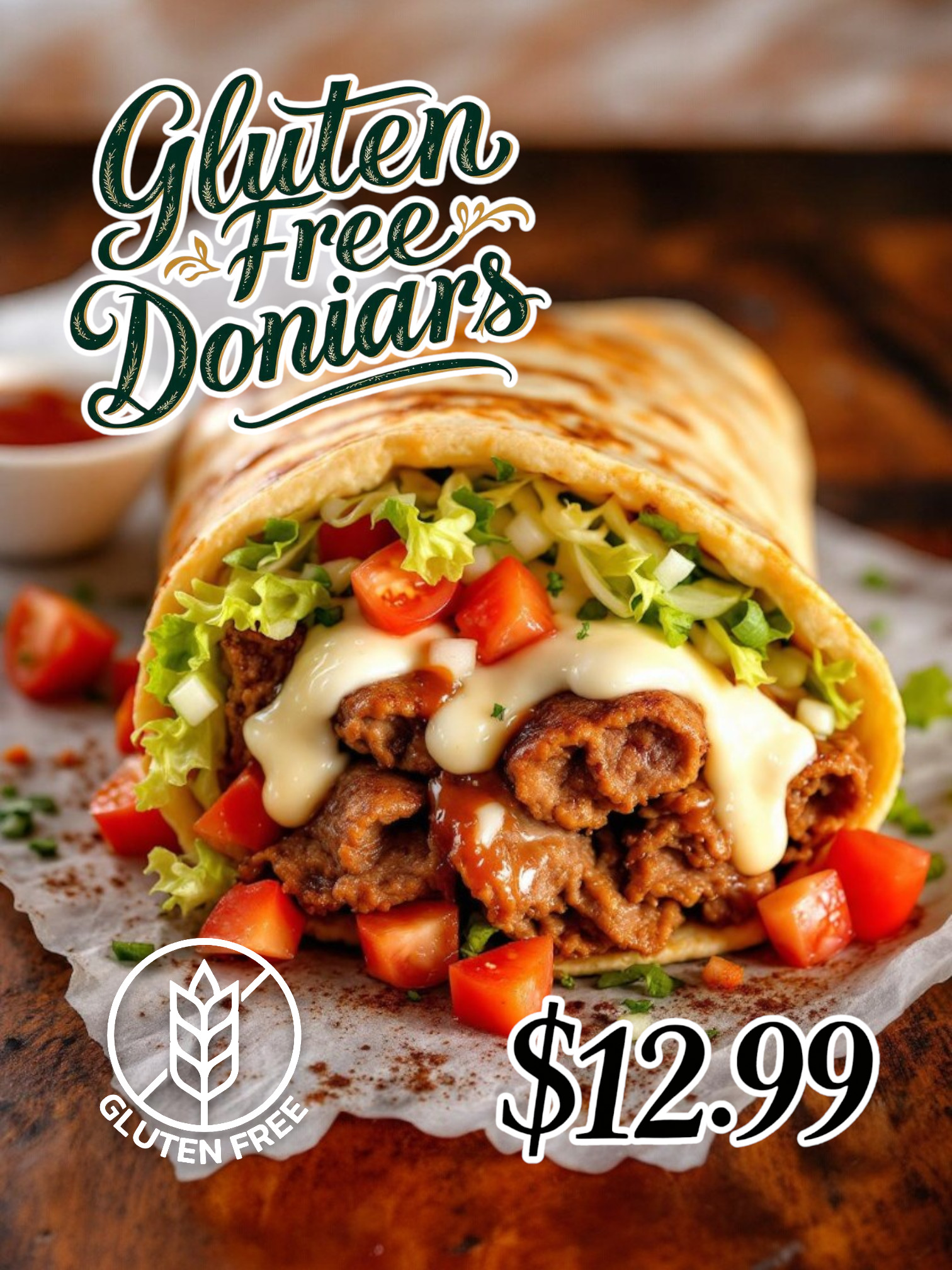 A twist classic GF Donair made on a GF Wrap! Comes with GF toppings such as lettuce, tomatoes, onion, mozza and GF doniar sauce (sweet sauce)!