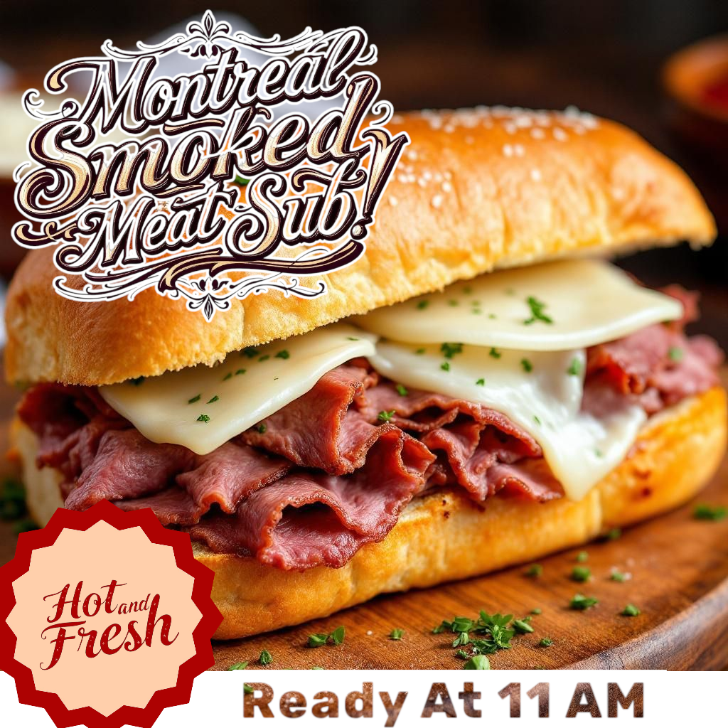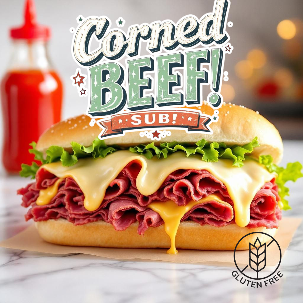 Get your GF Sub Loaded with hot corned beef or Montreal smoked beef (As we will have one or the other available, not both). Pick your toppings and sauces to make your sub customized to you!